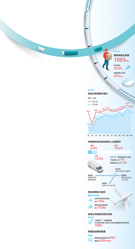 快遞業(yè)既貫通生產(chǎn)、分配、流通、消費(fèi)各環(huán)節(jié),又關(guān)聯(lián)一二三各產(chǎn)業(yè)。2021年,我國(guó)快遞業(yè)務(wù)量達(dá)1083億件,同比增長(zhǎng)29.9%。快遞業(yè)蓬勃發(fā)展,不僅有利于制造業(yè)通過(guò)兩業(yè)融合實(shí)現(xiàn)降本增效,更在走出去的步伐中助力“國(guó)貨出?!?,支撐跨境商品流動(dòng)更便利,為行業(yè)內(nèi)外帶來(lái)更多機(jī)遇。