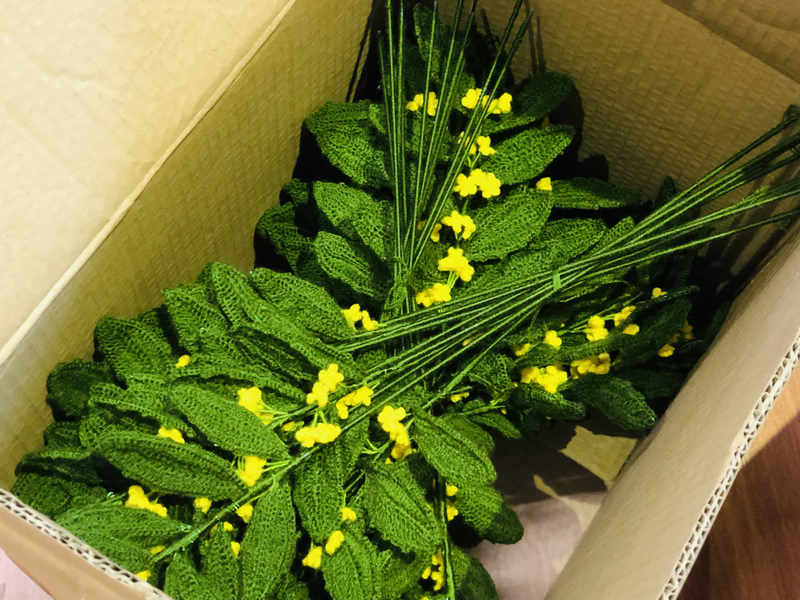 編織完成的絨線桂花成品被打包裝箱。親民社會工作服務(wù)中心供圖