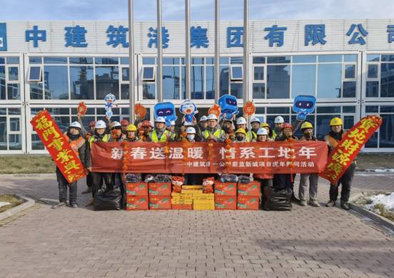 活動現(xiàn)場,蔚藍新城項目領導班子親切地問候了一線工友,并將棉手套、棉帽子、耳罩、春聯(lián)等春節(jié)慰問品送到工友兄弟們的手中,希望大家能夠在寒冬感受到項目的溫暖和關懷。