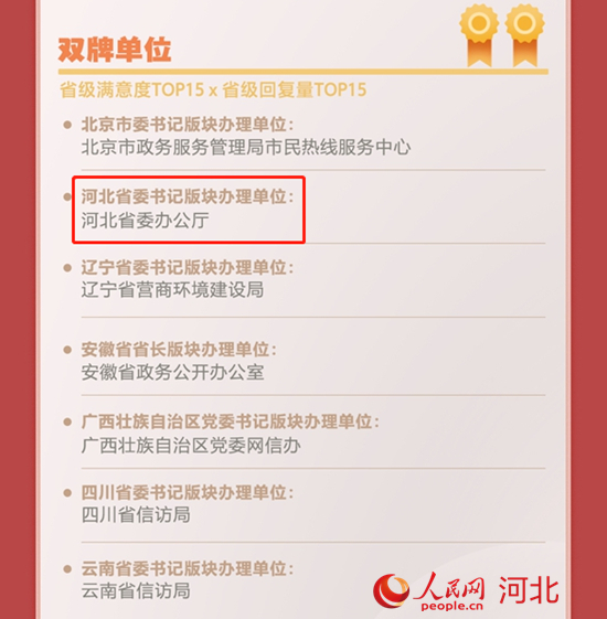 2021年,河北省委書記、省長留言版塊辦理單位雙雙入圍“2021年度人民網(wǎng)網(wǎng)上群眾工作民心匯聚單位”省級(jí)滿意度top15榜單。
