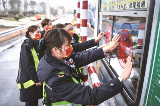 1月24日,在嘉興高速南湖收費站,南湖“紅船”巾幗服務(wù)隊的收費員們裝扮著收費站,向排隊等候取卡的駕駛員發(fā)放“福”字、防疫包和車載垃圾袋,送上一份暖暖的關(guān)愛。春節(jié)期間,收費員們將堅守崗位,用微笑服務(wù)春運,為高速公路暢通保駕護(hù)航。(王振宇)
