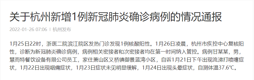 1月25日22時,浙醫(yī)二院濱江院區(qū)發(fā)熱門診發(fā)現1例核酸陽性。1月26日凌晨,杭州市疾控中心復核陽性,診斷為新冠肺炎確診病例,病例相關密接者和次密接者均在第一時間納入管控。病例甘某某,男,慧而特餐飲設備有限公司員工,家住蕭山區(qū)義橋鎮(zhèn)御景藍灣小區(qū),自訴1月21日下午出現流涕打噴嚏癥狀,1月22日出現咽痛癥狀,1月23日癥狀未見明顯緩解,1月24日出現頭暈癥狀,自測體溫37.6℃。