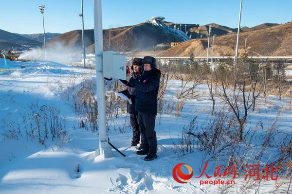 廊坊電力冬奧保障團(tuán)隊(duì)李小虎(右)和同事在國家越野滑雪中心賽道上檢查高壓配電室。 鄒明攝