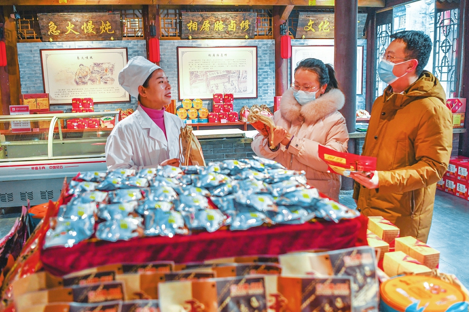 1月28日,游客在平遙古城一商店內(nèi)購(gòu)買(mǎi)年貨?;⒛甏汗?jié)將至,平遙古城內(nèi)花燈高掛,特色產(chǎn)品商店貨物充足,洋溢著濃濃的年味。(梁生仁攝)