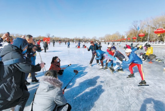 “雙奧之城新氣象——2022中外媒體北京行”走進什剎海冰場深入體驗老北京冰雪趣味運動。本報記者 吳鏑攝