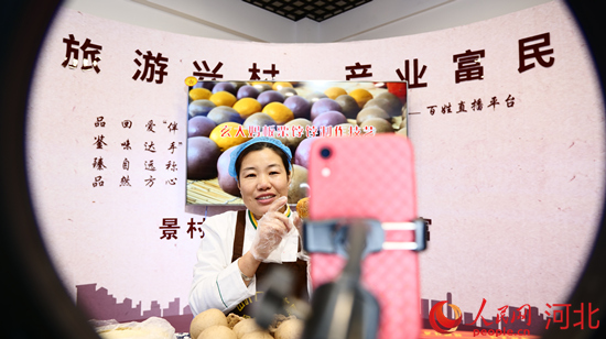 遷安市山葉口村村民劉海霞正在通過(guò)村史館里的“百姓直播平臺(tái)”銷售板栗餑餑等特色農(nóng)產(chǎn)品。 康永利攝