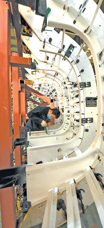 河北石家莊一家大型裝備制造企業(yè),技術(shù)人員在裝配飛機發(fā)動機短艙。