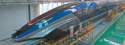 在位于山東青島的中車四方股份有限公司,工作人員對研發(fā)中的高速磁浮列車進行調(diào)試。