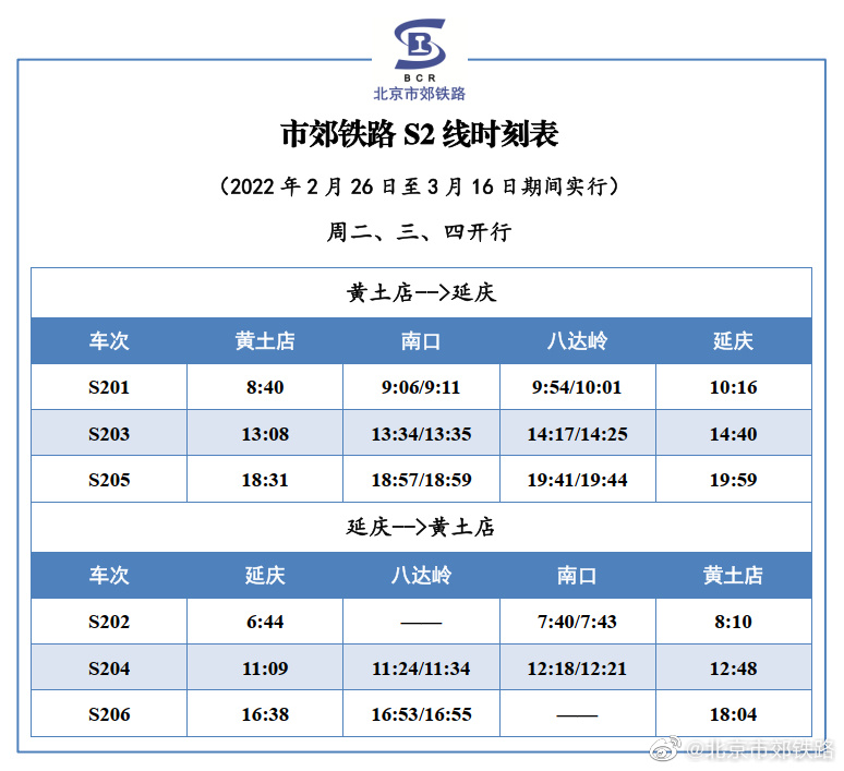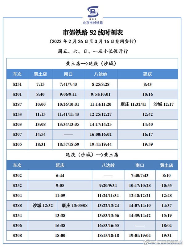 人民網(wǎng)北京2月25日電 據(jù)北京市郊鐵路官方微博消息,根據(jù)鐵路運(yùn)輸調(diào)整通知,2022年2月26日至3月16日, S2線恢復(fù)周二、三、四3對(duì)/日,周五、六、日、一及小長(zhǎng)假7對(duì)/日的列車(chē)開(kāi)行方案,列車(chē)開(kāi)行時(shí)點(diǎn)無(wú)變化,具體列車(chē)時(shí)刻表如下所示。