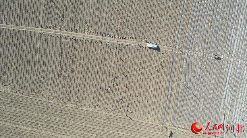 在河北省邯鄲市邱縣古城營鎮(zhèn)東杜林疃千畝西蘭花基地,村民正在栽植西蘭花苗(無人機(jī)照片)。孫海峰攝