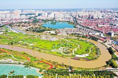 2021年10月12日拍攝的滄州市百獅園生態(tài)修復(fù)區(qū)。滄州市百獅園生態(tài)修復(fù)區(qū)原是大運河沿線的兩個城中村,目前已成為城市內(nèi)一道靚麗的風(fēng)景線。(資料片)新華社發(fā)