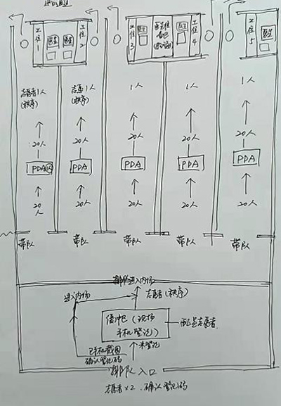 正如祁媛媛所說(shuō),靈感來(lái)源于實(shí)踐。靠著連日來(lái)在檢測(cè)一線工作的體驗(yàn),祁媛媛不斷摸索,反復(fù)思考,根據(jù)1-6個(gè)工位的不同組合,手繪了6張檢測(cè)流程圖,上面清晰地標(biāo)注著檢測(cè)的動(dòng)線、每個(gè)環(huán)節(jié)以及對(duì)應(yīng)的功能和注意事項(xiàng),從而能夠直觀地指導(dǎo)居村提升檢測(cè)效率,讓檢測(cè)如“流水線”般高效順暢。