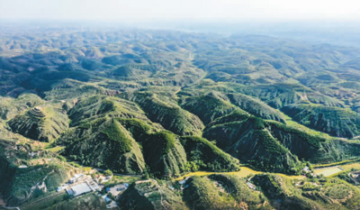 黃土溝壑中的陜西榆林市米脂縣銀州街道高西溝村滿眼綠色(無人機(jī)照片)。