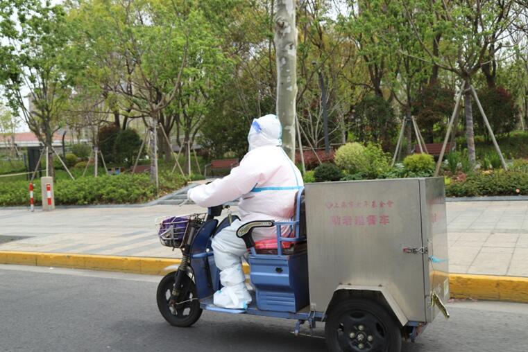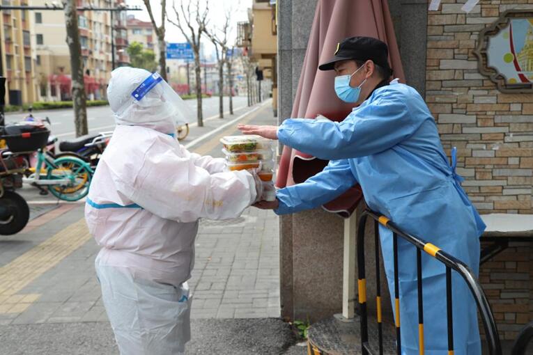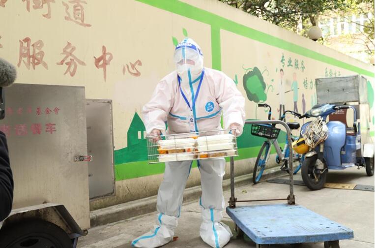 人民網(wǎng)上海4月1日電 (葛俊?。┥虾F治骱怂岷Y查首日。上午10:00,送餐員馬俊紅和張紅喜帶著剛剛出鍋的230份助老餐出發(fā)了。