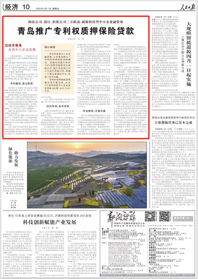 人民日?qǐng)?bào)點(diǎn)贊青島:推廣專利權(quán)質(zhì)押保險(xiǎn)貸款 破解科技型中小企業(yè)融資難