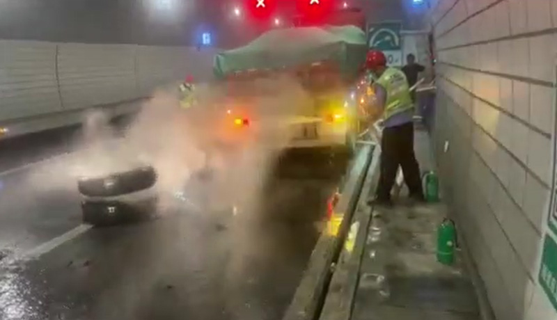 22點(diǎn)3分,巡查員通過(guò)對(duì)向隧道的汽通門(mén)第一時(shí)間進(jìn)入現(xiàn)場(chǎng),施救人員從同向到達(dá)現(xiàn)場(chǎng),一次“雙向奔赴”的救火就此展開(kāi)。一名巡查員與施救人員緊密配合,拿出水槍,對(duì)著起火點(diǎn)進(jìn)行滅火。不出2分鐘,起火點(diǎn)的明火被熄滅,但是溫度還是很高,需要不斷澆水才能阻止輪胎復(fù)燃。另一名巡查員則將司機(jī)帶離到安全地帶,隨后又將車道上的雜物清理至緊急停車帶,以便解除卡口后為后續(xù)車輛提供一個(gè)安全的行車環(huán)境。22點(diǎn)23分,車道恢復(fù)暢通。