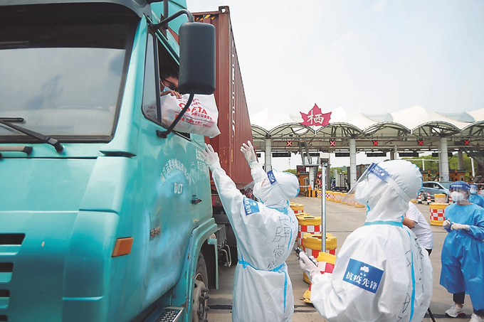 以“同心抗疫 我們?cè)谛袆?dòng)”為主題的貨車司機(jī)關(guān)愛活動(dòng)最近在我省多地開展,志愿者們?yōu)樨涇囁緳C(jī)送去“抗疫愛心包”,提供暖心服務(wù)。圖為20日,在南京繞城高速棲霞收費(fèi)站出口,志愿者向貨車司機(jī)送上“抗疫愛心包”。本報(bào)記者 陳儼 攝