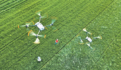 河南省尉氏縣植保隊員在麥田進行“一噴三防”作業(yè),與傳統(tǒng)方式相比,無人機噴灑可減少農(nóng)藥使用量。