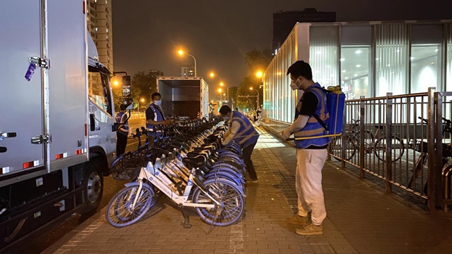 哈啰單車北京團(tuán)隊(duì)負(fù)責(zé)人胡濤介紹,近期團(tuán)隊(duì)臨時增加42名運(yùn)維人員和12輛調(diào)度車輛投入抗疫保障行動。對每輛共享單車在出庫、入庫、調(diào)運(yùn)等環(huán)節(jié)中實(shí)施100%消毒,在重點(diǎn)景區(qū)、商圈、寫字樓以及北京站、王府井、崇文門、望京等軌道交通站點(diǎn),每日分早中晚三個時段進(jìn)行無差別消殺。