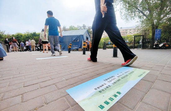 本報訊(實習(xí)記者 張佳琪)“這首詩我學(xué)過,是朱熹的《偶成》——少年易老學(xué)難成,一寸光陰不可輕?!弊蛱?,在海淀區(qū)羊坊店街道蓮花小區(qū)的中心廣場,許多家長和孩子正一起讀詩。有別于尋常親子共讀的是,這一幕出現(xiàn)在核酸采樣的隊伍里。地貼上的一首首詩,替代了普通的兩米線,家長和孩子在排隊的同時品讀古詩,一舉兩得。