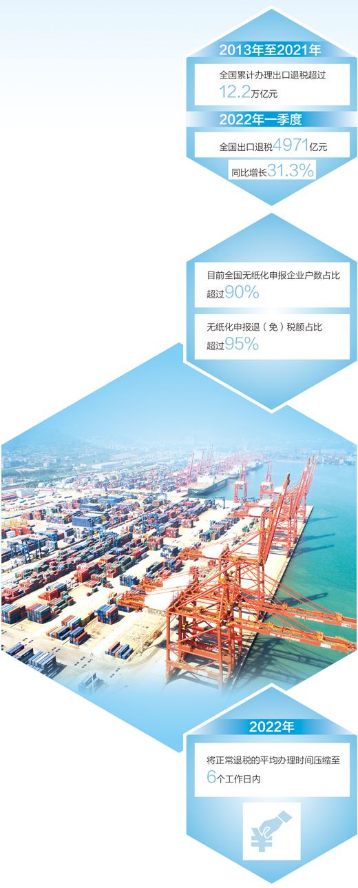資金是企業(yè)的生命線。為助力外貿(mào)企業(yè)發(fā)展,財稅部門落實出口退稅政策,持續(xù)優(yōu)化出口退稅管理。2020年國家提高1464項產(chǎn)品的出口退稅率,稅務(wù)部門加強宣傳輔導(dǎo)、精準推送,截至2021年底,共有9.4萬戶企業(yè)因這項政策受益,累計新增退稅377億元,進一步增強了競爭力和抗壓力。2021年,國家稅務(wù)總局以出口退稅信息系統(tǒng)整合優(yōu)化為契機,大幅簡并優(yōu)化退稅申報表單資料及辦稅流程,使出口退稅管理體系業(yè)務(wù)更全面、流程更優(yōu)化、權(quán)責更清晰、運行更高效。