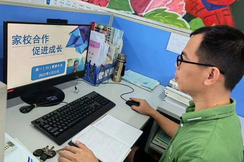 5月22號(捐獻(xiàn)造血干細(xì)胞的前一天),韓熠光在年級辦公室召開線上家長會。??谑械诙袑W(xué)供圖