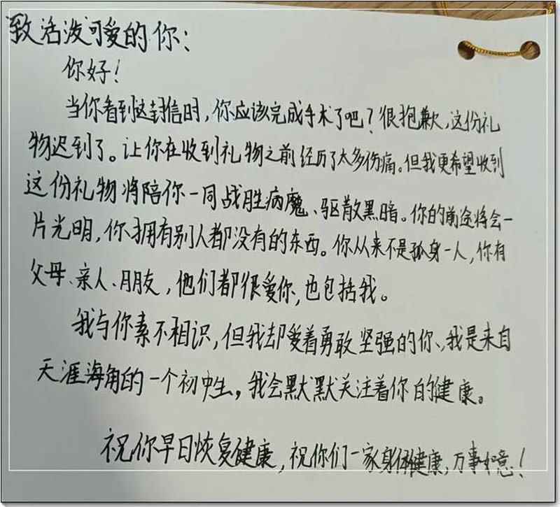 愛是傳遞也是傳承。韓熠光的女兒在得知父親去做捐獻(xiàn)手術(shù)時,手寫了一封祝福信寄給遠(yuǎn)方那位素不相識的“弟弟”,鼓勵他早日戰(zhàn)勝病魔,恢復(fù)健康。生命的種子,正伴隨著溫暖椰風(fēng),給6歲的小男孩送去生的希望……