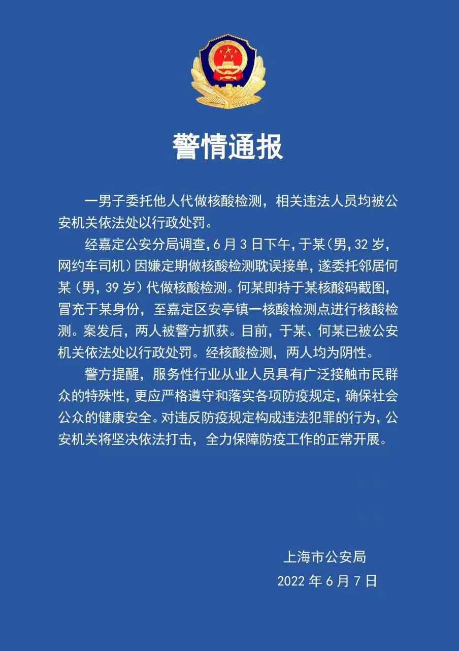經(jīng)嘉定公安分局調(diào)查,6月3日下午,于某(男,32歲,網(wǎng)約車司機)因嫌定期做核酸檢測耽誤接單,遂委托鄰居何某(男,39歲)代做核酸檢測。何某即持于某核酸碼截圖,冒充于某身份,至嘉定區(qū)安亭鎮(zhèn)一核酸檢測點進行核酸檢測。案發(fā)后,兩人被警方抓獲。目前,于某、何某已被公安機關(guān)依法處以行政處罰。經(jīng)核酸檢測,兩人均為陰性。