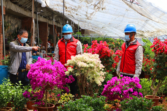 5月25日,冀北承德圍場公司四合永供電所黨員服務(wù)隊(duì)隊(duì)員到四合永鎮(zhèn)營字村海岱溝鳳利花卉園藝大棚檢查用電設(shè)備。 劉春學(xué)攝