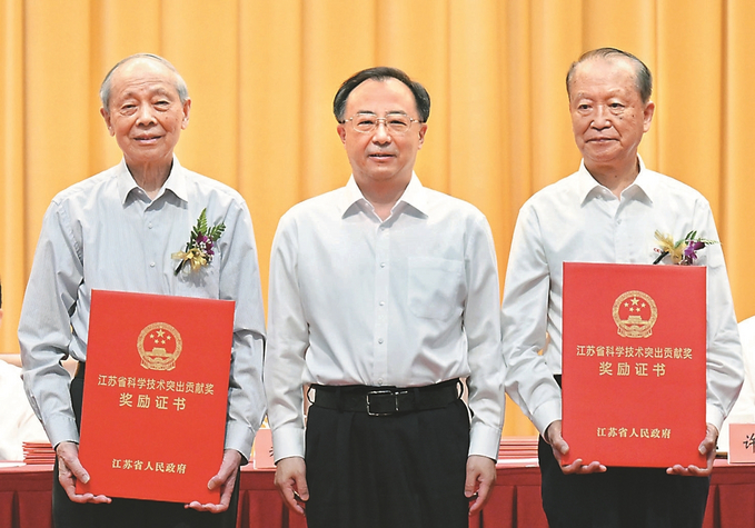 六月九日,省委、省政府舉行全省科學(xué)技術(shù)獎(jiǎng)勵(lì)大會(huì)。吳政隆為榮獲二〇二〇年度省科學(xué)技術(shù)突出貢獻(xiàn)獎(jiǎng)的中國工程院院士、中國電子科技集團(tuán)第十四研究所教授賁德(右)和中國科學(xué)院院士、南京大學(xué)教授鄭有炓頒獎(jiǎng)并合影。 本報(bào)記者 吳勝 朱江 攝