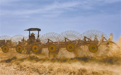 安徽省宿州市碭山縣張王莊村,農機手駕駛摟草機將小麥秸稈回收打包,用于有機肥加工、生物質發(fā)電、畜牧養(yǎng)殖等。