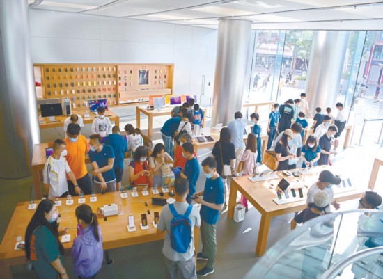 昨天,王府井APM購物中心蘋果產(chǎn)品零售店內(nèi),顧客在手機(jī)展示臺(tái)前駐足瀏覽,商場內(nèi)客流逐漸恢復(fù)。本報(bào)記者 和冠欣攝