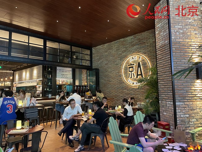 除了火鍋店,一家名為“京A Taproom”的美式精釀啤酒餐吧也熱鬧十足。美式工業(yè)風的裝潢極具格調(diào),炸雞配啤酒的組合也頗有人氣?!斑@里的氛圍我很喜歡,小吃和啤酒也很對我的胃口,來這里能夠忘掉那些煩惱和壓力?!崩钆吭诠ぷ髁艘惶熘螅s了朋友一起來這家餐吧放松心情。