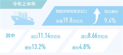 本報(bào)北京7月13日電?。ㄓ浾叨藕?jù)海關(guān)統(tǒng)計(jì),今年上半年我國(guó)貨物貿(mào)易進(jìn)出口總值19.8萬(wàn)億元,同比增長(zhǎng)9.4%。其中,出口11.14萬(wàn)億元,增長(zhǎng)13.2%;進(jìn)口8.66萬(wàn)億元,增長(zhǎng)4.8%。
