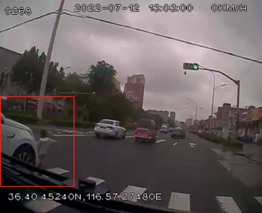 車載監(jiān)控畫面顯示,路口正值綠燈,一位4歲左右的兒童突然從斑馬線上跑出,橫穿馬路。危急時刻,開在道路最右側(cè)車道的濟南公交B120路駕駛員張濱迅速踩下剎車,在公交車停下的同時,張濱為提醒其它車輛注意到在駕駛視線盲區(qū)的兒童,趕緊將手伸出窗外不停揮舞、呼喊。