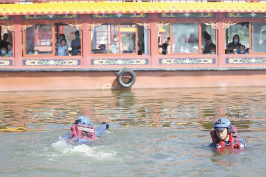 演練活動(dòng)中,救援隊(duì)員下水示范,帶來直觀的教育效果。本報(bào)記者 甘南攝