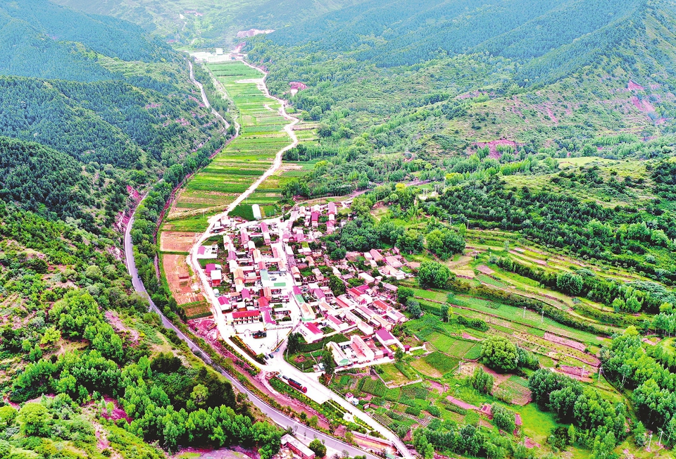 7月24日,俯瞰古交市邢家社鄉(xiāng)宋家莊村,道路蜿蜒,榛林蔥翠。近年來,該村依托當(dāng)?shù)刈匀画h(huán)境優(yōu)勢,以經(jīng)濟(jì)聯(lián)合社占股60%、農(nóng)民承包地入股占40%的方式經(jīng)營,實(shí)現(xiàn)大果榛子規(guī)?;?、集約化、產(chǎn)業(yè)化種植,舊日的撂荒地如今變成村民的聚寶盆。(記者劉通攝)