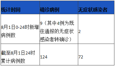 人民網(wǎng)成都8月2日電 (王波)據(jù)成都市衛(wèi)健委消息,8月1日0-24時(shí),“07·20”疫情新增本土確診病例9例(其中4例為既往通報(bào)的無癥狀感染者轉(zhuǎn)確診),新增本土無癥狀感染者2例。截至8月1日24時(shí),本起疫情累計(jì)報(bào)告本土確診病例124例,本土無癥狀感染者72例。