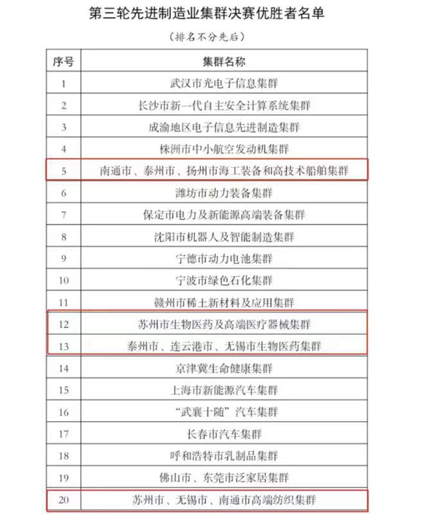 自2019年啟動先進(jìn)制造業(yè)集群培育工作以來,工信部圍繞新一代信息技術(shù)、高端裝備、新材料、生物醫(yī)藥等重點領(lǐng)域,搭建集群間相互比拼的“賽場”。此次江蘇入選的先進(jìn)制造業(yè)集群分別是:南通市、泰州市、揚(yáng)州市海工裝備和高技術(shù)船舶集群,蘇州市生物醫(yī)藥及高端醫(yī)療器械集群,泰州市、連云港市、無錫市生物醫(yī)藥集群,蘇州市、無錫市、南通市高端紡織集群。