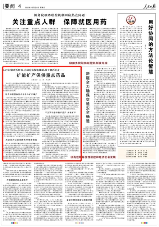 針對當前防疫治療藥物需求激增造成短期“買藥難”問題,山東迅速發(fā)布了“保供工作方案”,確定了“防疫醫(yī)療藥品和器械保供企業(yè)名單”,并派駐駐廠服務員,與工信部駐企特派員一起,幫助企業(yè)解決生產中面臨的原料、設備、運輸等問題?!澳壳埃綎|正大力推動防疫治療藥物擴能增產,山東新華制藥的布洛芬原料藥和制劑已滿負荷生產,山東抗原檢測試劑日產能明年1月將提升1.5倍,‘三藥三方’之一的宣肺敗毒顆粒,明年1月產能將提高1倍?!鄙綎|省工信廳有關負責人說。
