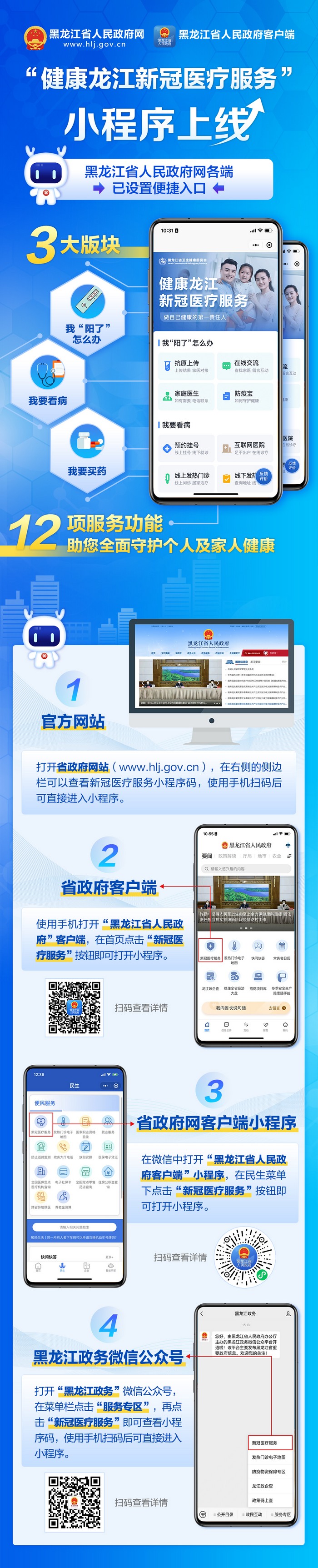 “健康龍江新冠醫(yī)療服務(wù)”小程序已經(jīng)正式上線,為了讓全省人民更加便捷地找到小程序,及時(shí)獲取服務(wù),黑龍江省人民政府網(wǎng)站、官方客戶端、小程序、官方微信公眾號(hào)等平臺(tái)已全面開(kāi)通“健康龍江新冠醫(yī)療服務(wù)”便捷入口。3大板塊12項(xiàng)服務(wù)功能助您全面守護(hù)個(gè)人及家人健康。