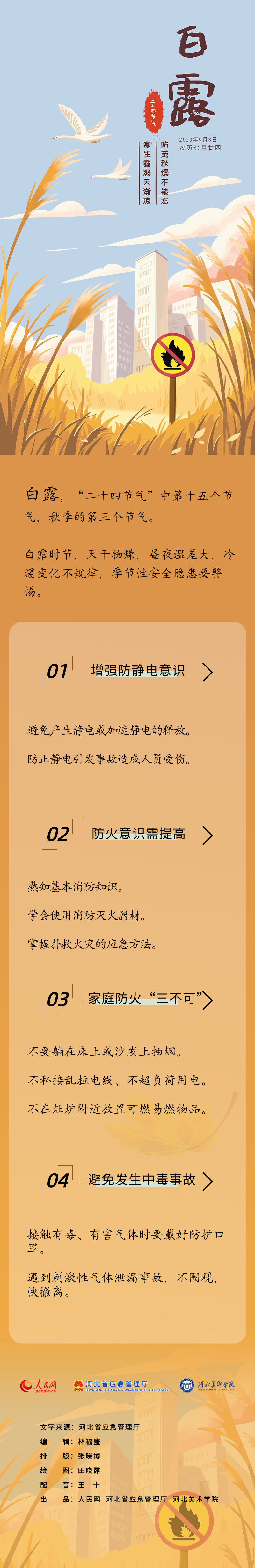 白露,“二十四節(jié)氣”中第十五個節(jié)氣,也是秋季的第三個節(jié)氣。白露時節(jié),天干物燥,晝夜溫差大,冷暖變化不規(guī)律,季節(jié)性安全隱患要警惕。近期,人民網(wǎng)與河北省應(yīng)急管理廳共同推出二十四節(jié)氣安全海報。今天,和小編一起來了解白露時節(jié),有哪些安全避險小知識吧。