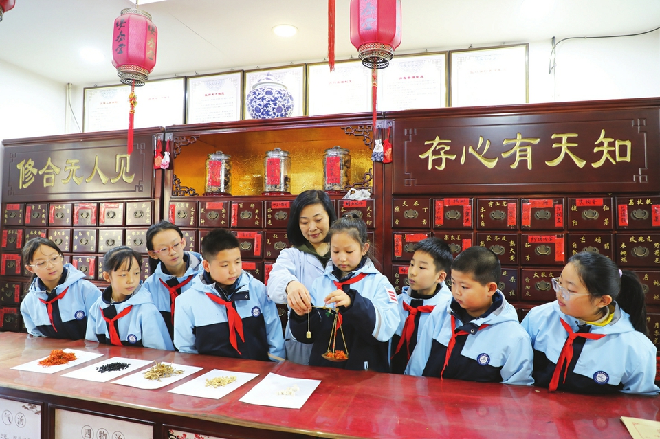 12月7日,陽泉市城區(qū)小陽泉北社區(qū)黨委聯(lián)合陽泉市實(shí)驗(yàn)小學(xué),開展了“學(xué)習(xí)草藥知識(shí)、感受中醫(yī)魅力”課外實(shí)踐活動(dòng)。孩子們來到藥店,通過識(shí)別中草藥、稱量、加工中草藥材等具體活動(dòng),近距離體驗(yàn)中醫(yī)藥傳統(tǒng)文化特色,感受中醫(yī)藥魅力。圖為孩子們?cè)谒巹煹闹笇?dǎo)下稱量中草藥。(張春林?jǐn)z)
