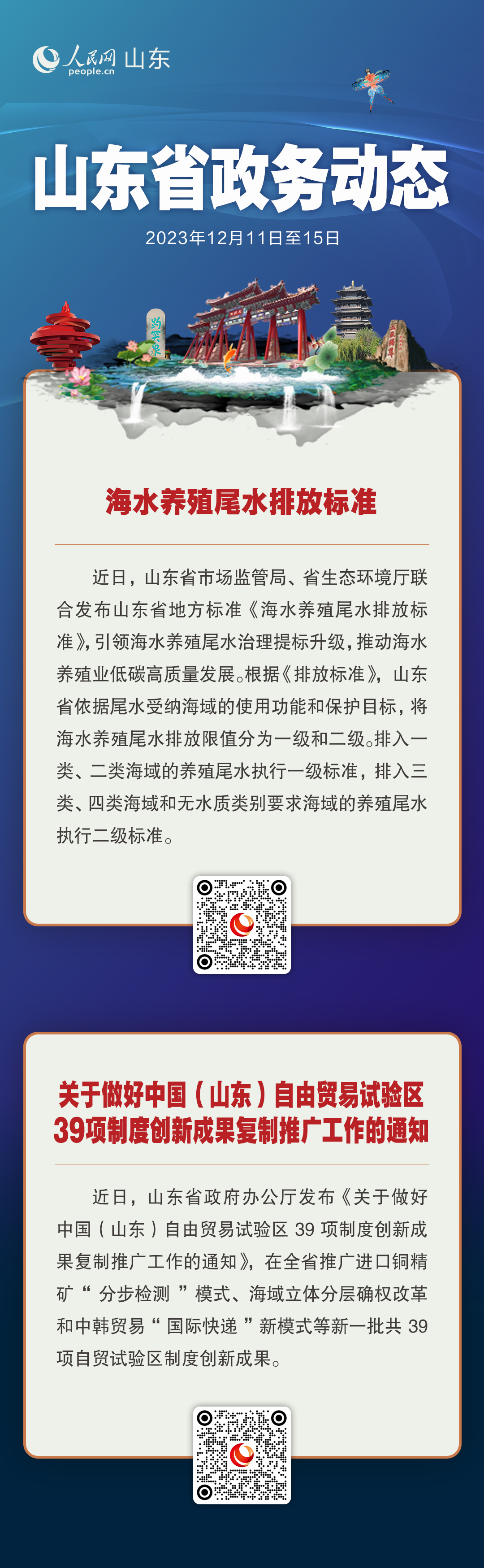 本周(12月11日至15日),山東省出臺了《海水養(yǎng)殖尾水排放標(biāo)準(zhǔn)》《關(guān)于做好中國(山東)自由貿(mào)易試驗(yàn)區(qū)39項(xiàng)制度創(chuàng)新成果復(fù)制推廣工作的通知》,具體如下: