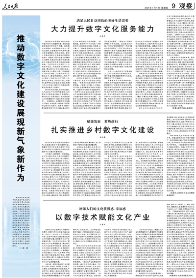 建設(shè)數(shù)字中國是數(shù)字時代推進(jìn)中國式現(xiàn)代化的重要引擎,是構(gòu)筑國家競爭新優(yōu)勢的有力支撐。數(shù)字文化建設(shè)是數(shù)字中國建設(shè)的重要組成部分。習(xí)近平總書記在黨的二十大報告中指出:“實施國家文化數(shù)字化戰(zhàn)略,健全現(xiàn)代公共文化服務(wù)體系,創(chuàng)新實施文化惠民工程?!边@為我們推進(jìn)數(shù)字文化建設(shè)指明了前進(jìn)方向、提供了根本遵循。新時代新征程,如何提升數(shù)字文化服務(wù)能力?如何推動數(shù)字文化產(chǎn)業(yè)高質(zhì)量發(fā)展?如何扎實推進(jìn)鄉(xiāng)村數(shù)字文化建設(shè)?本期觀察版圍繞這些問題進(jìn)行探討。