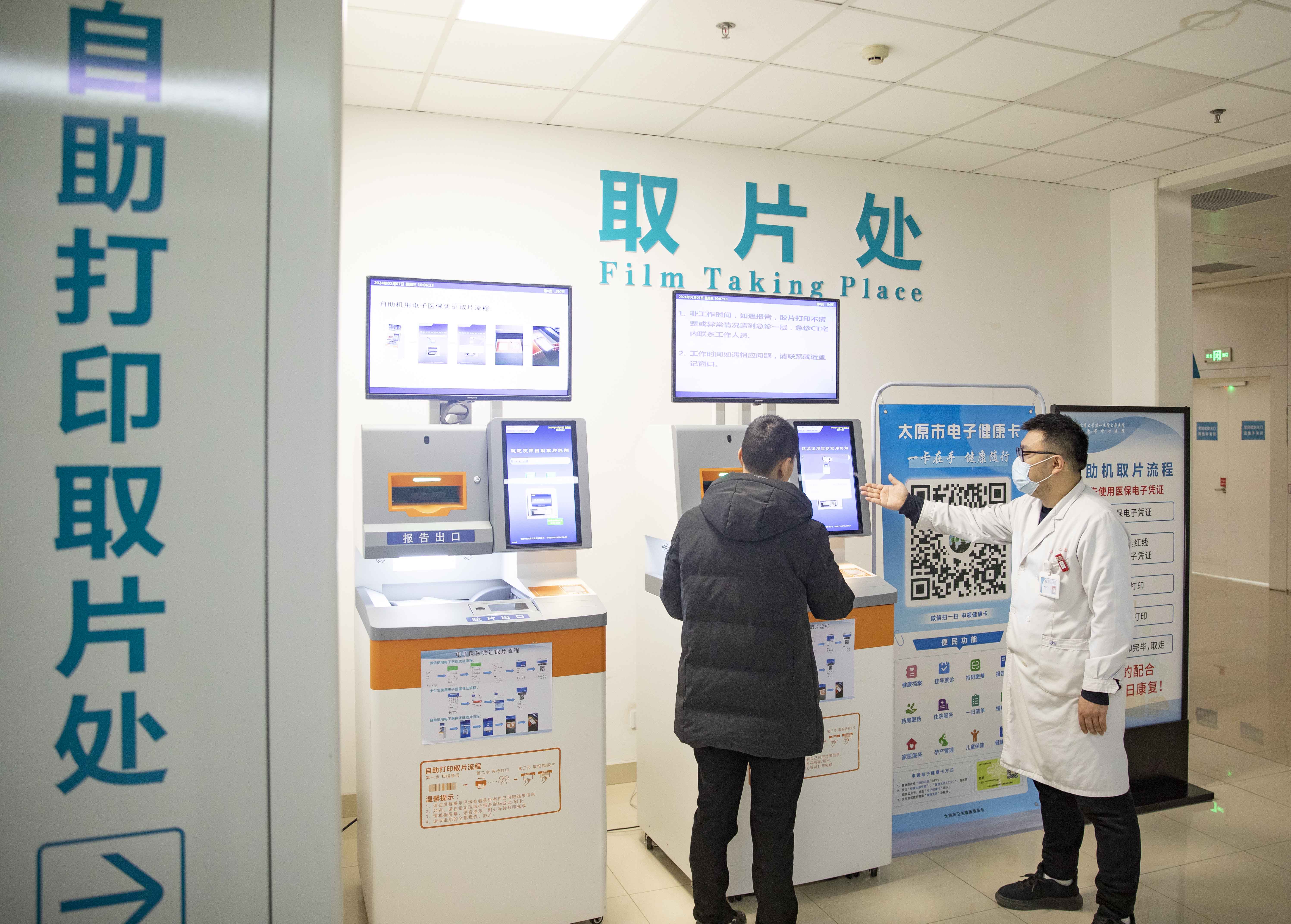 北大醫(yī)院太原醫(yī)院(市中心醫(yī)院)汾東院區(qū)醫(yī)護(hù)人員指導(dǎo)患者使電子健康卡自助掃碼取片。人民網(wǎng)記者王帆攝