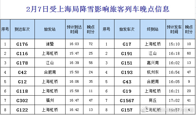 據(jù)@北京南站官方微博消息,受上海局降雪影響,北京南站京滬高鐵部分到達、始發(fā)列車有不同程度晚點。截至目前,具體晚點情況信息如下,請廣大旅客及時關(guān)注12306官方信息和車站公告。