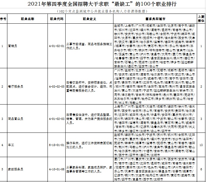 2021年第四季度全國(guó)招聘大于求職“最缺工”的100個(gè)職業(yè)排行前五位(人社部供圖)