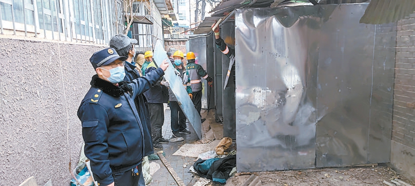 廣安門內(nèi)街道綜合執(zhí)法隊工作人員正在對私建鐵皮棚進行拆除。