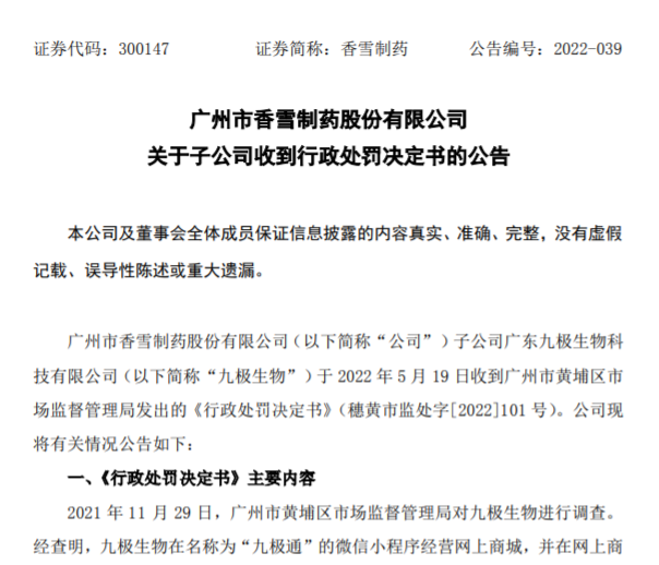 對此,香雪制藥表示,已要求九極生物主動調(diào)整生產(chǎn)計劃,更改下架相關(guān)廣告;對相關(guān)責(zé)任人員進行處罰;組織工作人員對相關(guān)法律法規(guī)進行學(xué)習(xí),完善內(nèi)部管理制度與操作規(guī)程,嚴格按照規(guī)定對產(chǎn)品宣傳進行規(guī)范管理。截至本公告披露日前,相關(guān)整改已完成。